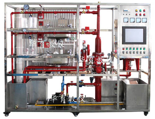消防給水系統(tǒng)主要有給水箱、噴淋泵、穩(wěn)壓罐、濕式報(bào)警閥、壓力開關(guān)、水流指示器、消防給水管道、閉式噴淋頭等組成。管路采用鍍鋅管進(jìn)行設(shè)計(jì),可進(jìn)行鍍鋅管的切割、套絲、安裝和通水試驗(yàn)操作,通過控制系統(tǒng)可實(shí)現(xiàn)噴淋滅火功能。
